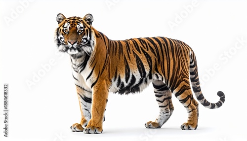 Full body portrait of a majestic adult tiger standing and looking at the camera. Realistic wild predator big cat with orange and black stripes isolated on a clean white background studio shot.