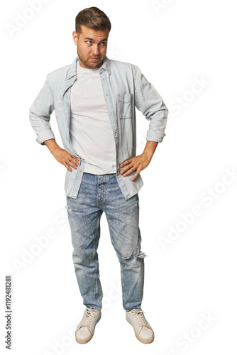 pensive, puckering, uncertain, disappointed, thoughtful, bewildered, doubt, choose, serious, uncertain, thinking, concept, dissatisfied, question, objection, confuse, lip, doubtful, ignore, young, caucasian, man, standing, full, body, studio, portrait, casual attire, model, fashion, style, modern, trendy, individual, pose, professional, photo, light, neutral, profile, glance, attire, confident, sharp
