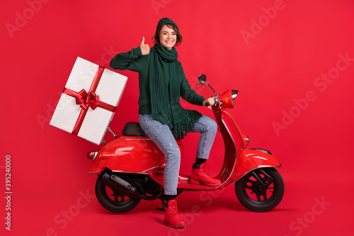 Full body portrait of lady sitting moped thumb up green hat boots jeans x-mas package isolated on red color background