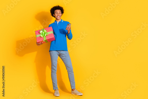 Full body portrait of nice young man smart phone giftbox empty space isolated on yellow color background