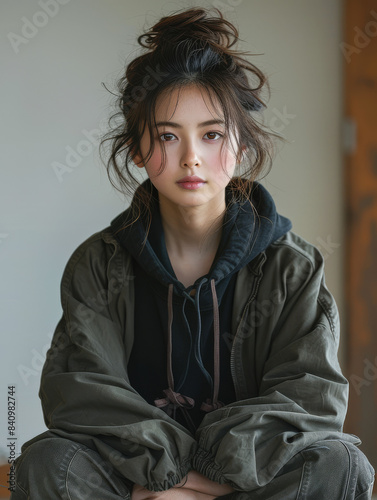 full body shot sitting with crossed legs on a chair,of Japanese female created with Generative AI technology
