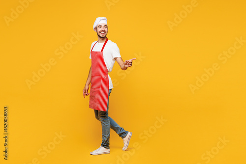 Full body young housewife housekeeper chef cook baker man wearing red apron toque hat point index finger aside on area walk go isolated on plain yellow orange background studio. Cooking food concept.
