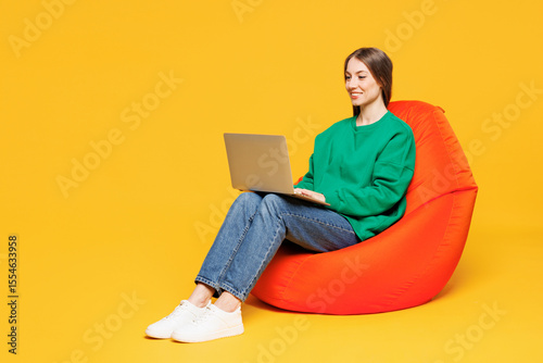 Full body young IT woman she wears green sweatshirt casual clothes sit in bag chair hold use work on laptop pc computer isolated on plain yellow orange background studio portrait. Lifestyle concept.