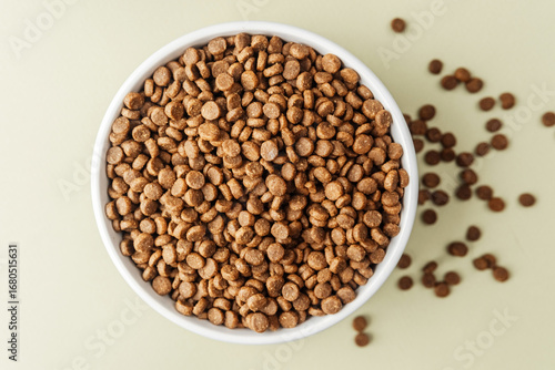 dog, kibble, food, dry, bowl, scattered, beige, background, crunchy, snack, pet, ingredient, tasty, pellet, texture, animal, round, protein, brown, isolated, grain, meal, clean, overhead, portion, vitamin, scoop, breakfast, lunch, dinner, bite, treat, chew, domestic, concept, modern, healthy, doggy, product, cute, organic, closeup, care, minimal