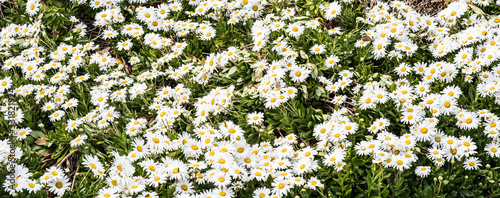 Full frame panoramic image of white daisy flowers with yellow centers