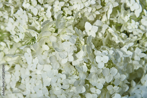 Full frame white hydrangea as a backdrop. Floral background, copy space, design.