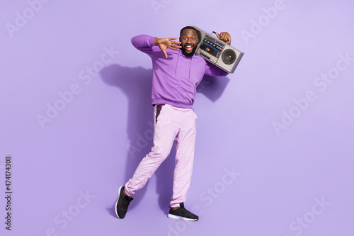 Full length body size view of attractive cheerful crazy funny guy with player having fun moving isolated on violet purple color background