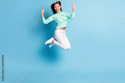 Full length body size view of lovely cheerful carefree teen girl jumping having fun isolated over bright blue color background
