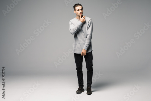 full length photo of a young fashion man with his hands folded, looking into the camera and smiling.on gray background