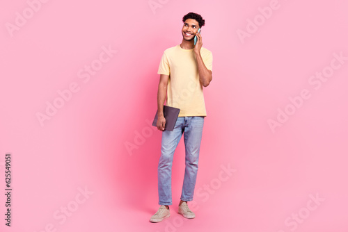 Full length photo of cool guy wear yellow shirt denim pants hold laptop look empty space talk on phone isolated on pink color background