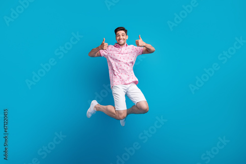 Full length photo of excited sporty person jumping hands fingers demonstrate thumb up isolated on blue color background