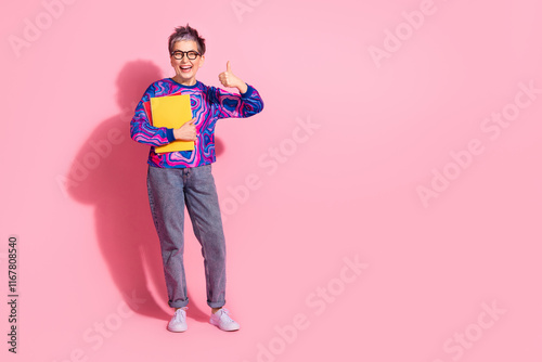 Full length photo of lovely pensioner lady hold copybooks thumb up dressed blue colorful garment isolated on pink color background