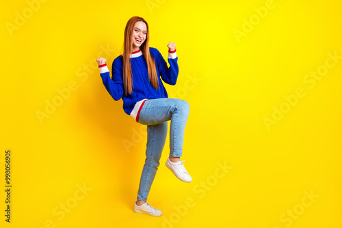 Full length photo of lovely young lady raise fists winning dressed stylish blue knitwear garment isolated on yellow color background