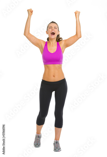 fitness, fit, sport, gymnastics, exercise, train, athlete, woman, female, girl, isolated, white, white background, trainer, training, young, happy, felicity, rejoicing, rejoice, success, successful, winner, achievement, attainment, sportswoman, activewear, physical exercise, health, health care, wellness, healthy, slim, thin, well-being, caucasian, brunette