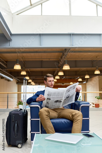 Full length portrait of handsome young man with suitcase reading newspaper sitting in leather armchair while waiting for check in in modem hotel