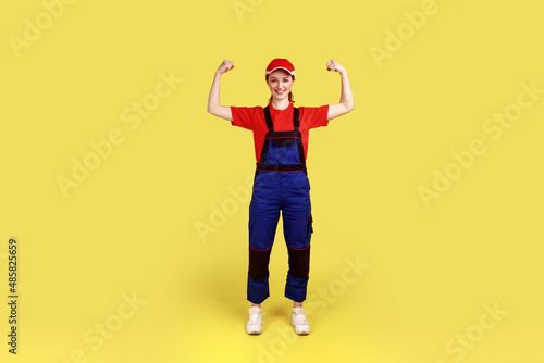 Full length portrait of optimistic woman worker standing and looking at camera with raised arms, showing her power, wearing overalls and red cap. Indoor studio shot isolated on yellow background.
