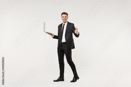 Full length young employee business corporate lawyer man wearing classic formal black grey suit shirt tie work in office hold laptop computer show thumb up gesture isolated on white background studio.