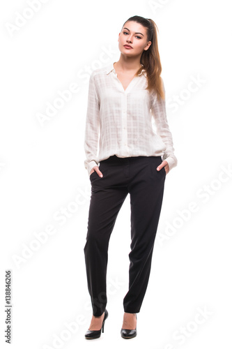 Full length young woman straight posing in studio isolated on white background