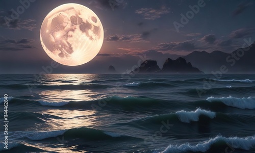 Full moon in the ocean with waves and ripples, water, tides, moon phase