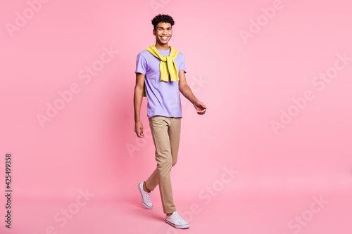 Full size photo of nice optimistic brunette guy go wear t-shirt pants isolated on pink color background
