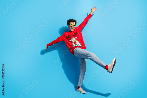 Full size photo of pretty young male dancing have fun wear red christmas sweater masquerade theme party on blue color background