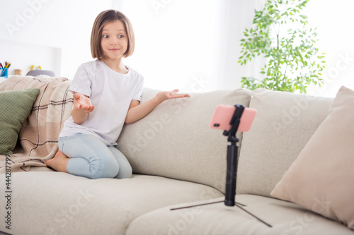 Full size photo of young school girl happy positive smile make video vlogger tutorial cellphone sit couch home