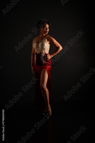 Full-length portrait of a young beautiful curly dark-haired woman in a red dress in shadows on a black background