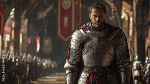 expansive, view, fully, armored, knight, grand, hall, banner, weapon, presence, strength, honour, battle, realism, detailed, depiction, armoring, vibrant, colours, historical, authenticity, surrounding, grandeur, imposing, mediaeval, warrior, bequest, awe, reverence, castle, combat, readiness, craftsmanship, heroic, setting, epic, atmosphere