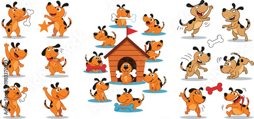 Fun Animated Dog Set with Playful Poses, Bones, and a Doghouse, Perfect for Pet-Themed Designs and Children's Illustrations