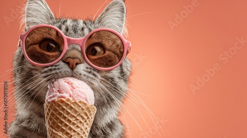 Funny animal pet summer holiday vacation photography banner - Closeup of cat with sunglasses, eating ice cream in cone, isolated on apricote background