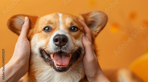Funny cute puppy dog with hand patting portrait , studio shooting high quality photo pet on yellow background, wallpaper, wall art