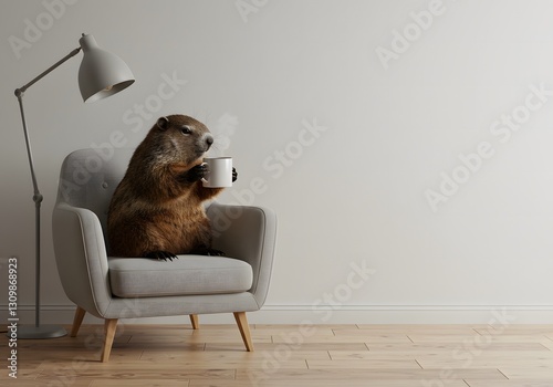 groundhog, hot drink, chair, cosy, relaxing, humorous, animal, cute, funny, wildlife, nature, living room, home decor, furniture, lamp, wooden floor, steam, hot drink, relaxation, warmth, illustration, photorealistic, still life, contemporary, minimalist, comfort, funny animals, coffee break, domesticated, brown, white, spring, autumn, interior design, 3d image, cup, sitting, home interior