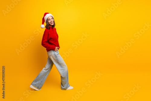 Funny holiday stroll with Santa hat girl in red sweater and blue jeans exuding merry cheerful mood against bright yellow background