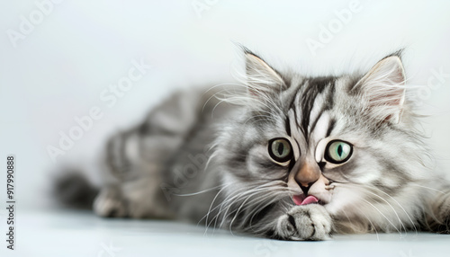 Funny large longhair gray kitten with beautiful big green eyes lying on white table. Lovely fluffy cat licking lips. Free space for text