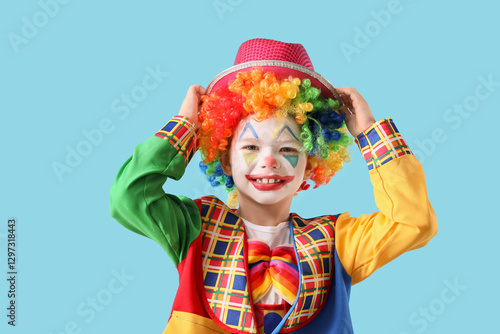 Funny little boy in clown disguise with hat on blue background. April Fool's Day celebration