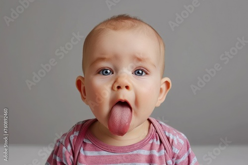 funny newborn baby shows long tongue isolated on solid white background