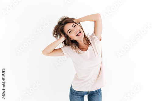 woman, casual attire, 20s, adult, attractive, background, beautiful, beauty, caucasian, cute, female, girl, white, hair, indoor, inside, isolated, long, only, people, portrait, posing, pretty, shot, single, studio, t-shirt, young, brunette, space, funny, playful, playing, holding, open, mouth, looking, camera