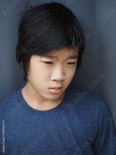 Funny portrait of 11 years old asian boy with dark blue t shirt