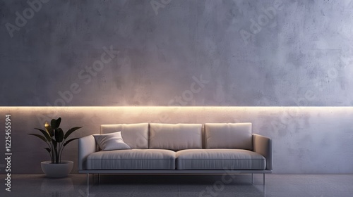 Furniture arrangement with illuminated light, couch, and wall in muted tone