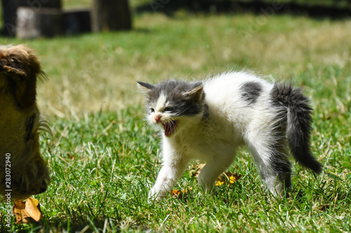 Furry little kitten scared from a dog. Danger for pets, dog and small kitty