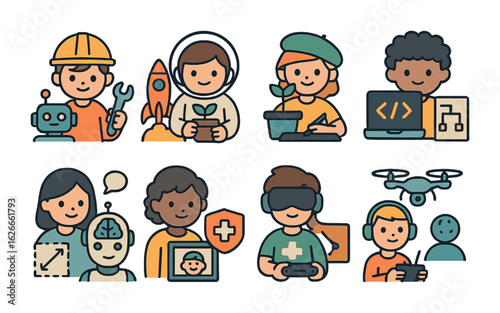 future, career, children, flat, vector, mini, illustration, profession, colours, children, robot, engineer, space, farmer, digital, artist, code, architect, trainer, virtual, medic, avatar, designer