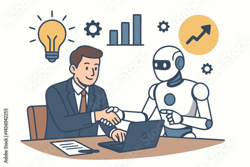 human, ai, collaboration, robot, businessman, handshake, partnership, technology, business, artificial intelligence, automation, future, innovation, growth, success, agreements, deal, synergy, office, desk, laptop, computer, vector, illustration, icon, graphic, chart, graph, light bulb, idea, gear, setting, cyborg, android, man, corporate, manager, employee, work, job, meeting, analysis, datum, progress, efficiency, productivity, digital, transformation, workflow