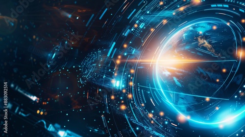 Futuristic backdrop with shades of blue and black. Abstract design with a sunrise. Rockets and satellites circling Earth. Glowing energy beams with moving particles. Science and technology.