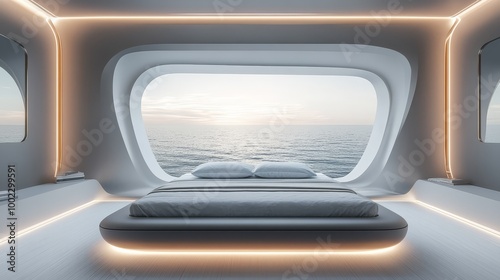 Futuristic bedroom with panoramic ocean view and minimalist design, showcasing a serene and modern aesthetic.