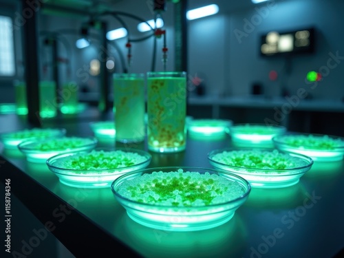Futuristic bioenergy laboratory showcasing glowing bioluminescent culture plates and innovative energy solutions