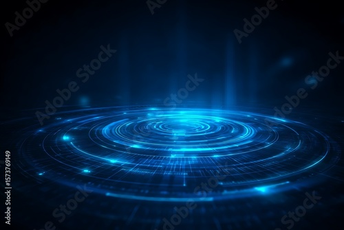 Futuristic blue digital interface with concentric glowing circles and light beams on a dark background