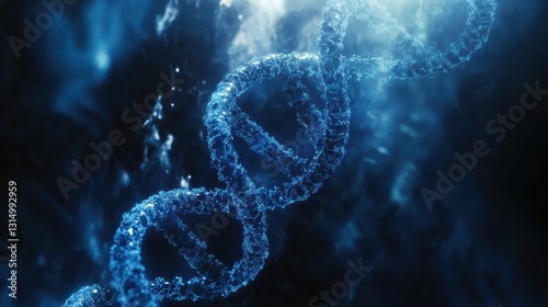 Futuristic blue dna double helix rotating with light rays and dust particles on a dark background, a science or medical concept