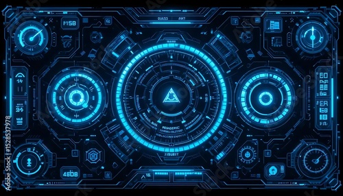 glowing, futuristic, geometric, shape, digital, technology, science fiction, panel, display, information, graphic, round, circular, triangle, abstract, control panel, machine, artificial intelligence, computing, datum, cyber, virtual, high technology, modern, dark, illustration, complex, background, engineering, technical, backlit, computer