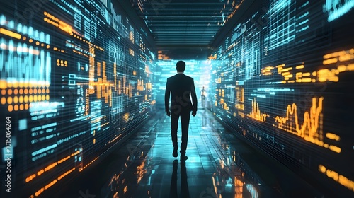 Futuristic Businessman Walks Data-Driven Investment Hallway with Projected Analytics