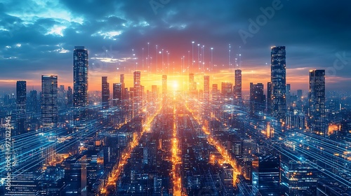 Futuristic city glowing under a night sky, with bright neon lines representing data pathways connecting the sleek high-tech towers.